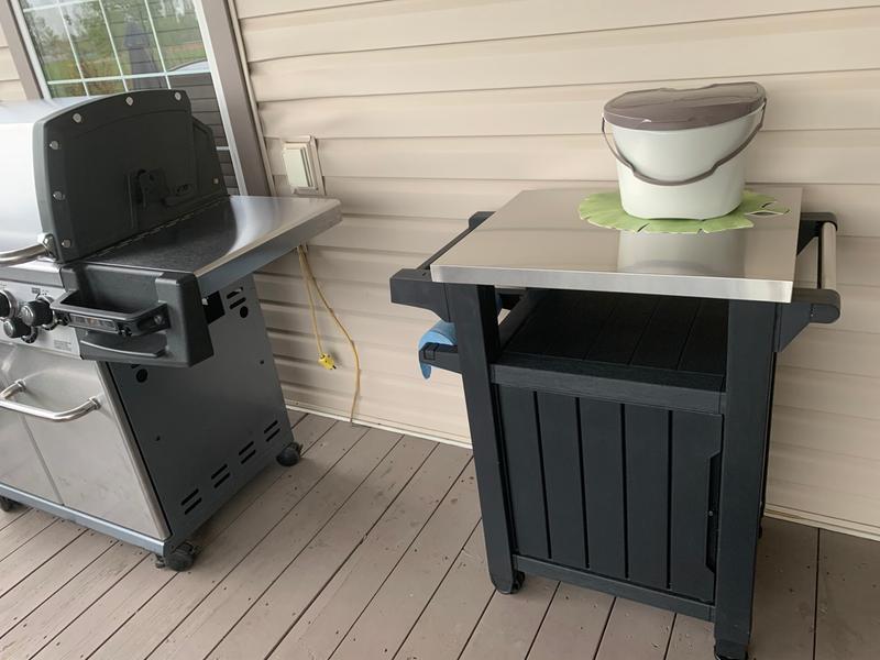 Assembly was super easy, as long. 201 grade stainless steel upper surface for preparing and serving while being easy to clean. This plastic outdoor kitchen storage cabinet combines two storage solutions in one. Storage table, grill cart and prep station. Includes two side bars for paper towel or hook holder with 4 hook hangers, spice rack and bottle opener.